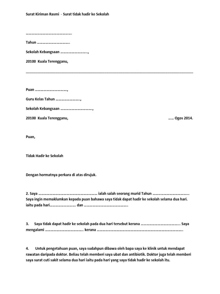 Oleh sebab itu, anda perlulah menulis surat memohon cuti kerja untuk mendapatkan kebenaran majikan. Contoh surat rasmi tidak hadir ke sekolah atas pelbagai alasan munasabah; Contoh surat cuti sakit sekolah menengah berikut dikongsikan contoh yang mudah dan ringkas beberapa surat rasmi makluman kepada pihak . I) contoh surat tidak hadir ke sekolah (cuti sakit) . Surat tidak hadir ke sekolah ditulis dengan format surat kiriman rasmi. Moms sedang tidak enak badan dan berencana mengambil cuti sakit? Atas nasihat doktor, saya mengambil keputusan untuk berehat di rumah. Guru kelas tingkatan 1 cerdik 5 oktober 2020 tuan puan memohon pengecualian kehadiran ke sekolah atas kebimbangan penularan covid 19.